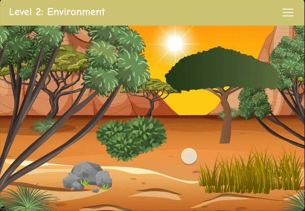 Level three, called “Follow the Food, " is designed to teach children about lion eating habits. Players must select all the food required to survive during migration. The four food options consist of one incorrect option and three correct options, requiring the players to rank the food choices in order of energy value to survive the migration.