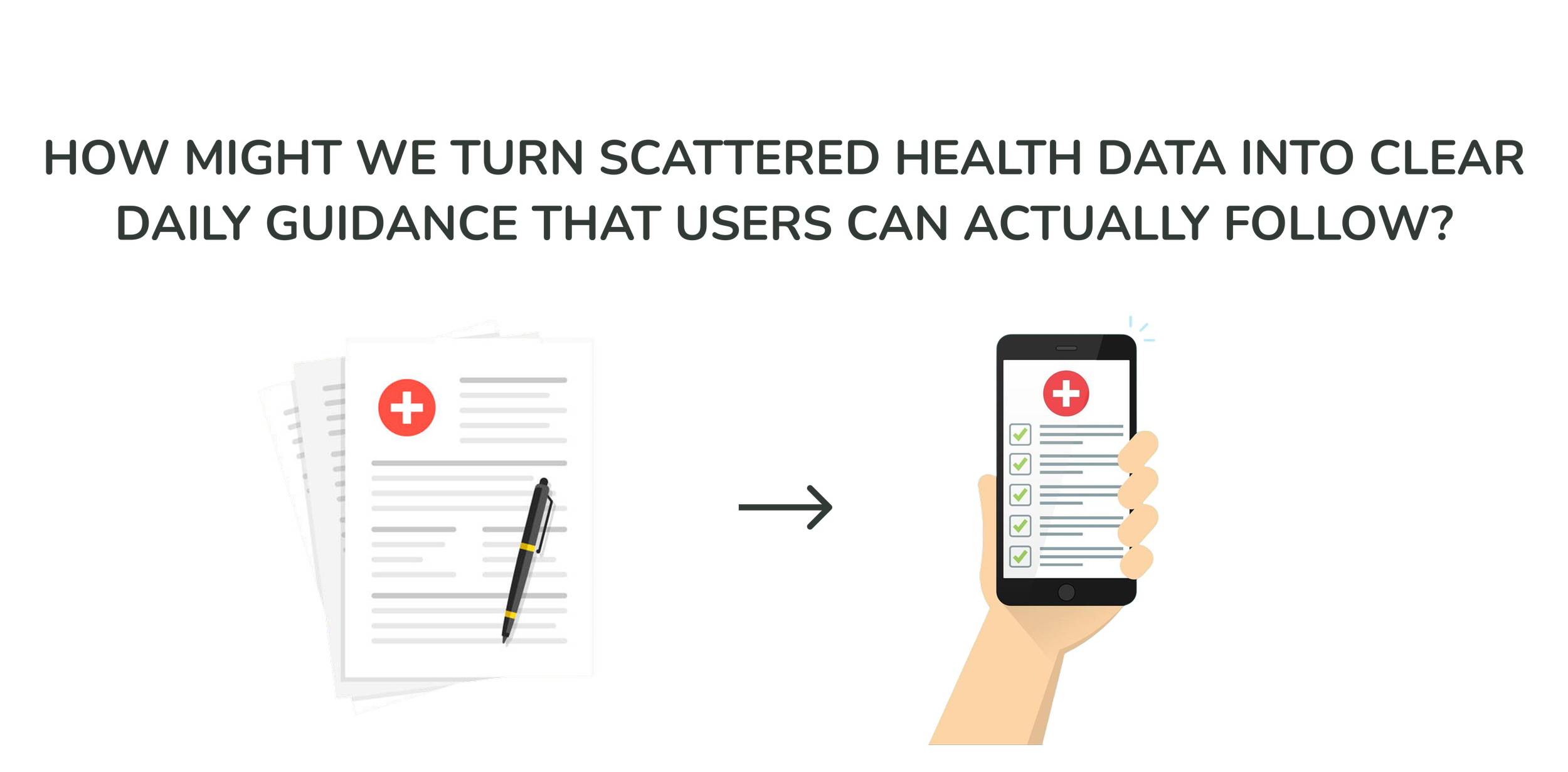 Users managing long-term conditions face two compounding barriers: fragmentation (results and vitals scattered across devices and portals) and translation (medical PDFs and charts that are hard to interpret). The outcome is anxiety, decision fatigue, and plans that slowly drift off track.